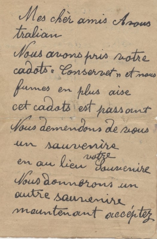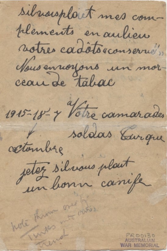 ''Sevgili Avustralyalı dostlarımız. Gönderdiğiniz konserve eti aldık ve bundan çok memnun kaldık. Gerçekten çok güzel bir hediyeydi. Sizden bir hatıra istiyoruz, karşılığında biz de size bir tane vereceğiz. Lütfen teşekkürlerimizi kabul edin. Konserve ete karşılık olarak size biraz tütün gönderiyoruz. Silah arkadaşlarınız Türkler.''