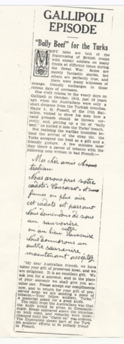 Avustralya 17. Taburu'nda görevli Binbaşı Leslie George Fussell, askerlerine el bombasının nasıl atılması gerektiğini göstermek için yakınında bulunan bir kutu sığır eti konservesini Türk siperlerine doğru fırlattı. Türk askerleri, bunun bir saldırı girişimi olduğunu anlamadı. Aksine, konserveyi dostça bir hediye olarak yorumladı. Yiyeceği alıp paylaştılar, ardından, bu jesti karşılıksız bırakmadılar.