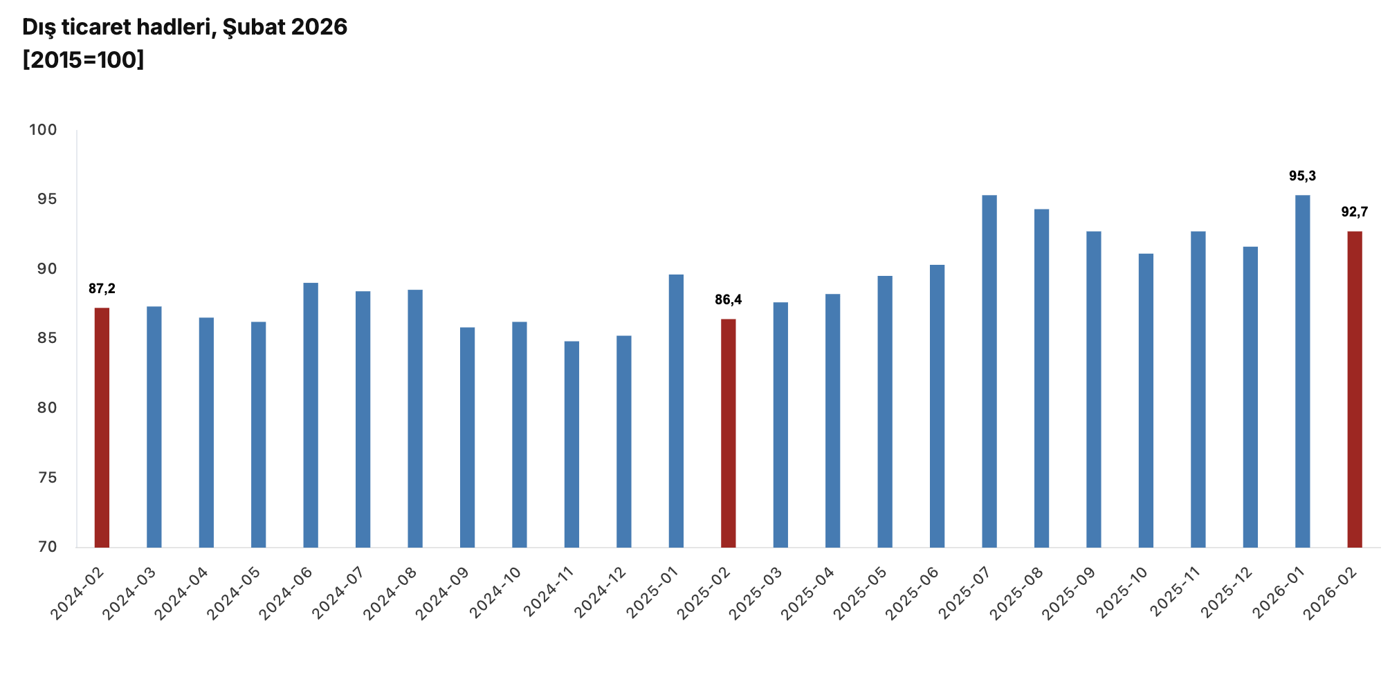 İhracat birim değer endeksinin ithalat birim değer endeksine bölünmesiyle hesaplanan ve 2025 yılı Şubat ayında 86,4 olarak elde edilmiş olan dış ticaret haddi, 6,3 puan artarak, 2026 yılı Şubat ayında 92,7 oldu.