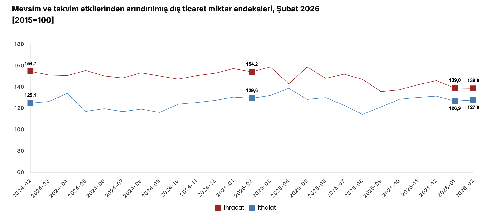 Mevsim ve takvim etkilerinden arındırılmış seriye göre ihracat miktar endeksi; 2026 Ocak ayında 139,0 iken 2026 Şubat ayında yüzde 0,1 oranında azalarak 138,8 oldu. Takvim etkilerinden arındırılmış seriye göre ise ihracat miktar endeksi; 2025 yılı Şubat ayında 141,8 iken 2026 yılı Şubat ayında yüzde 10,1 oranında azalarak 127,5 oldu.