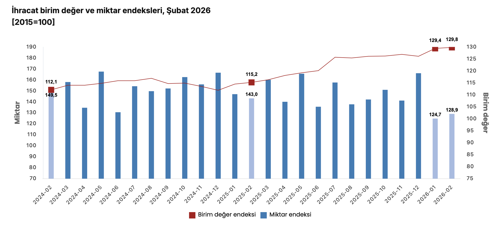 Türkiye İstatistik Kurumu’nun (TÜİK) verilerine göre, ihracat birim değer endeksi Şubat ayında bir önceki yılın aynı ayına göre yüzde 12,7 arttı. Endeks bir önceki yılın aynı ayına göre gıda, içecek ve tütünde yüzde 12,5 arttı, ham maddelerde (yakıt hariç) yüzde 9,7 arttı, yakıtlarda yüzde 6,8 azaldı, imalat sanayinde (gıda, içecek, tütün hariç) yüzde 13,3 arttı.