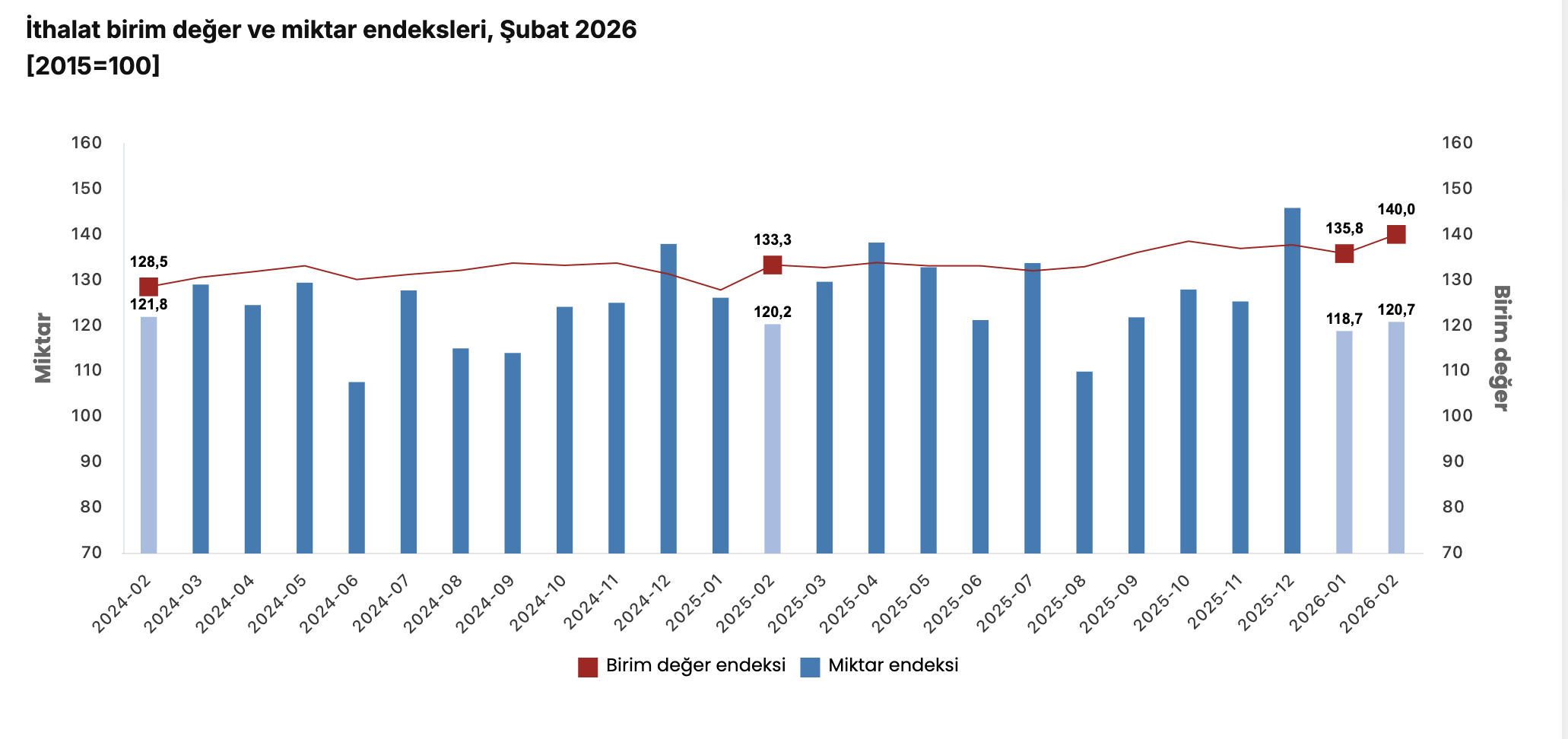 Mevsim ve takvim etkilerinden arındırılmış seriye göre ithalat miktar endeksi; 2026 Ocak ayında 126,9 iken 2026 Şubat ayında yüzde 0,7 oranında artarak 127,9 oldu. Takvim etkilerinden arındırılmış seriye göre ise ithalat miktar endeksi; 2025 yılı Şubat ayında 121,3 iken 2026 yılı Şubat ayında yüzde 1,3 oranında azalarak 119,7 oldu.